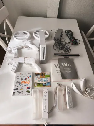 Consola Nintendo Wii en color blanco, junto con varios accesorios para disfrutar de tus juegos. - Consola Wii - 2 Mandos Wii Remote y Nunchuk. Más mejora de uno de los mandos. - Fundas protectoras para mandos - Volantes para juegos de carreras - Pistolas para juegos de disparos - Sensor Bar - Cables de conexión - Juegos: Wii Play y Wii Sports Vitaminada