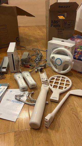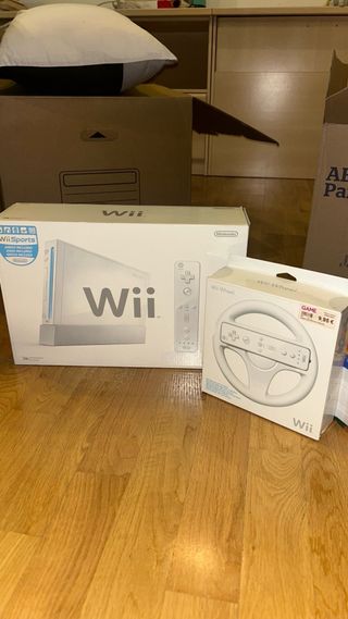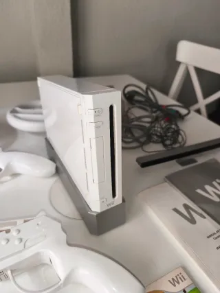 Consola Nintendo Wii con accesorios. - Incluye Wii Sports con todos los accesorios - Incluye accesorio Wii Wheel. - 2 mandos con funda - soporte plateado de Wii - Caja original + instrucciones - Cableado completo - Volante de COCHE