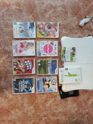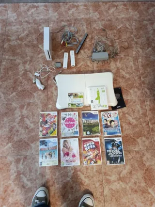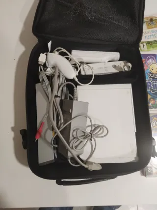 Consola Nintendo Wii completa con accesorios y juegos. - Incluye consola Wii, mando, nunchuk, sensor bar y balance board. - Juegos incluidos: Wii Sports y Wii Fit. - Cableado y adaptadores de corriente.
