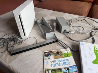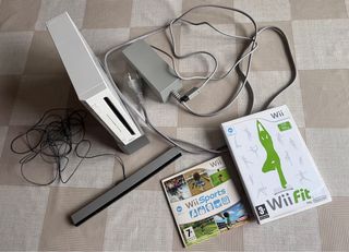 Consola de videojuegos Nintendo Wii en color blanco, con sus accesorios y juegos. - Incluye consola Wii. - Incluye sensor bar. - Incluye adaptador de corriente. - Incluye juego Wii Sports. - Incluye juego Wii Fit.