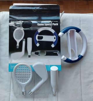 Pack de accesorios para Wii que incluye elementos para varios deportes. - Bate de béisbol. - Raqueta de tenis. - Palo de golf. - Incluye correa de mano para mando Wii. Hay una pestaña rota. No queda ajustada pero se puede jugar con ello