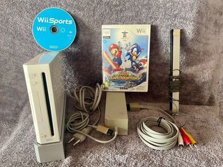 Lote Nintendo compuesto por: - Consola Nintendo Wii sin mandos con su base original. - 3 cables de conexión originales Nintendo. - 1 Juego Wii en buenas condiciones: Wii Sports (sin carátula) - Carátula Mario & Sonic en los Juegos Olímpicos de Invierno (vacía)