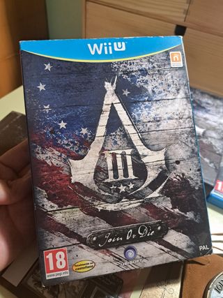 Assassins Creed 3 edición limitada de coleccionistas Join or Die para la Nintendo Wii U. En muy buenas condiciones. La funda exterior tiene desgastes en los bordes y manchas en los laterales. Todo el contenido (caja interior, libro, marcapáginas, medallón y funda, y el juego) está impoluto, como nuevo. Todo está en español. NO NEGOCIABLE. Funciona perfectamente. Preferiblemente trato en mano en Málaga. Envío a toda España pago previo por PayPal o Bizum costando 6€ el envío certificado. Tengo más de 1000 votos positivos. Tengo más juegos en mi perfil. Asassins, asasins, assasins