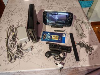 Consola Wii U en color negro, ideal para disfrutar de tus juegos favoritos. Este lote incluye varios accesorios. - Consola Wii U - Base de carga - Adaptador de corriente - Sensor Bar - Cables varios