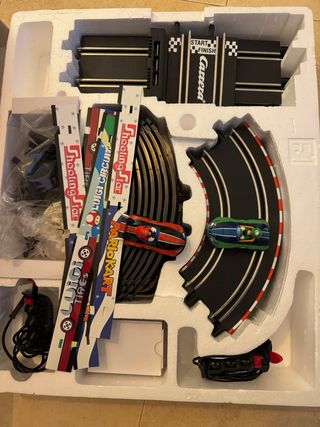 Sistema de carreras de slot a escala 1:43 de Mario Kart Wii. - Incluye coches y pistas. - Diseño inspirado en Mario Kart Wii.