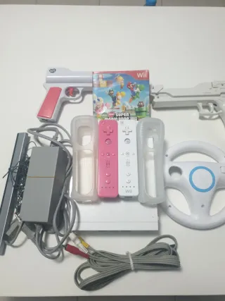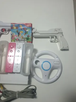 Pack de consola Wii con varios accesorios para ampliar tu experiencia de juego. - Incluye dos pistolas. - Volante para juegos de carreras. - Dos mandos (uno rosa y otro blanco). - Base para la consola. - Cargador y cables de conexión.