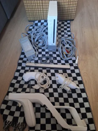 Completo lote de accesorios para Nintendo Wii. FALTAN LOS MANDOS PRINCIPALES WII REMOTE - Consola Wii blanca. - Adaptador de corriente. - Cable AV con conexiones RCA. - Sensor Bar. - Nunchuk blanco. - Wii Zapper (accesorio para pistola).