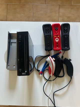 Consola Nintendo Wii edición limitada con base, sensor y todos los cables originales y caja. - 2 mandos con fundas - 6 juegos - 2 volantes Mario Kart con caja original - 2 mandos Nunchuk - Adaptador a TV - Sensor de consola