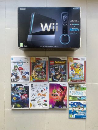 Consola Nintendo Wii negra ( retrocompatible game cube ) Wii sport resort pak, en caja + 9 juegos Buen estado TODOS LOS COMPONENTES SON ORIGINALES Y OFICIALES NINTENDO Lista de los juegos en caja de plástico ( todos en castellano ) : - Mariokart Wii con manual - Mario strikers charged football con manual - Batman 2 DC super heroes sin manual - Poképark Wii con manual - Super Mario Galaxy con manual - Wii play con manual - Zumba fitness manual Lists de los juegos que vienen con el pack : - Wii sports - Wii sports resort Envío rápido