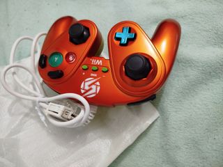 Mando con cable para Wii y Wii U (mando clásico), con un diseño inspirado en Samus y forma de mando de gamecube - Compatible con Wii y Wii U. - Color naranja metálico. - En caja - Se puede usar para jugar juegos de gamecube en Wii sin tener mando de gamecube (se conecta al mando de Wii) El precio baja a 20€ si lo compras con una Wii Hago envíos por inpost, POR CORREOS NO, no negocio Puede tener alguna marca normal de uso pero en general está en buen estado y funciona