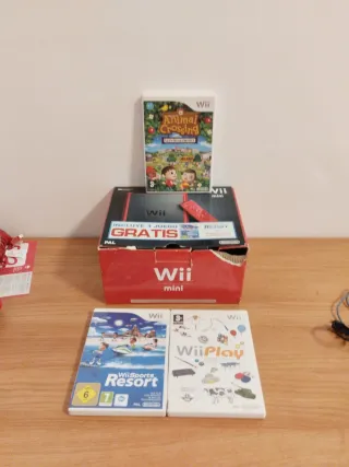 Wii Mini en color rojo y negro, con menos de 100 horas de uso, incluye 2 mandos y 2 nunchuks, todo el cableado original, manual original y caja original. Incluye esos 3 juegos.