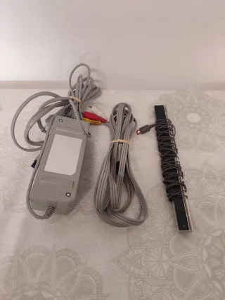 Conjunto de cables para consola Wii. - Cable de alimentación. - Cable AV con conectores RCA (rojo, blanco, amarillo). - Sensor , se le ha caído un embellecedor Por 5 € mas te llevas la consola que no lee discos