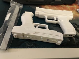 Pack de dos pistolas blancas para Nintendo Wii, compatibles con la barra sensor Dolphin. - Incluye dos pistolas de plástico blanco. - Incluye barra sensor. - Ideal para juegos de disparos en Wii , Pc , Batocera , Retrobat , etc...