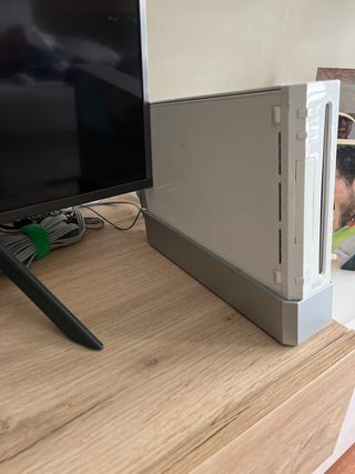 Vendo una consola Nintendo Wii blanca en buen estado. Incluye: - Consola Wii. - Ventilador trasero (foto 2) - 2 mandos Wii + 3 nunchucks. - 2 micrófonos - 3 juegos: 'Let's Sing', 'We Sing', y 'La Voz'. + Wii sports + otros. *** El soporte del sensor está dañado (foto 5). Se puede usar igual o se puede poner el sensor sin él. **** SOLO VENTAS EN PERSONA (por tamaño del paquete) regalo Wii Family Trainer, juego de alfombras (foto 4).
