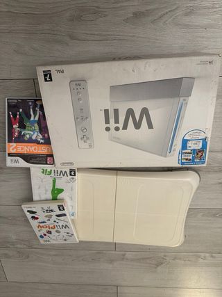 Consola Nintendo Wii en color blanco, junto con su plataforma Wii Balance Board y tres juegos. - Incluye la consola Wii. - Incluye la plataforma Wii Balance Board. - Juegos incluidos: Wii Fit, Wii Play, Just Dance 2.