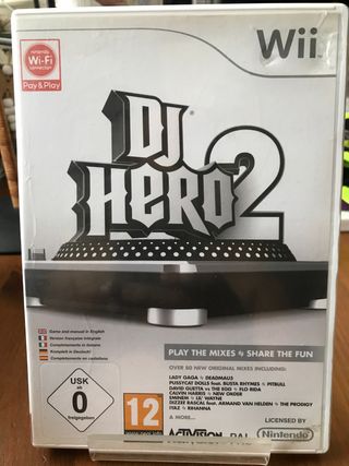 Juego DJ Hero 2 para Wii en buenas condiciones. Incluye el juego y su manual de instrucciones en inglés, italiano y alemán. - Compatible con Wii. - Más de 80 temas originales. - Artistas como Lady Gaga, Deadmau5, Pitbull y más.