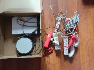 Consola Wii con dos mandos, sus baterías, cargador de mandos, distintas tapas, fundas con cuerda, volante para algún juego, mando nunchuck, micrófonos (para juego de los 40 principales, por ejemplo), y juegos: - Wii Sports Resort - Violetta, Ritmo y música - Wii Sports - New Super Mario Bross - Los Sims 3 - 40 Principales Karaoke Party - Just dance 2014 - Just dance 4 - Wii Party - Zumba Fitness World Party (Imagen) - Ferrari Challenge Deluxe Todos se entregan en su caja original, no puedo subir todos, Wallapop no me lo permite, si tienes alguna duda dime! Tiene varios años la Wii pero no le hemos dado demasiado uso. Precio negociable!