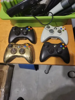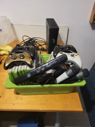 Lote de videojuegos y accesorios para Xbox 360. - Consola Xbox 360. - Sensor Kinect. - 4 mandos (2 negros, 1 dorado, 1 blanco). - 2 micrófonos. - 20 juegos de Xbox 360.