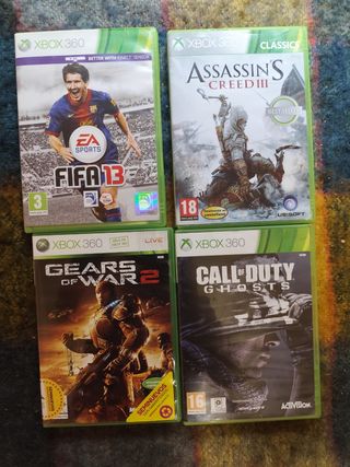 Vendo 4 juegos de Xbox 360 en buen estado. Incluyen: FIFA 13 - 4€ Assassin's Creed III -3€ Gears of War 2 - 5€ Call of Duty Ghosts - 4€ Todo 18€ El lote incluye un mando Xbox 360