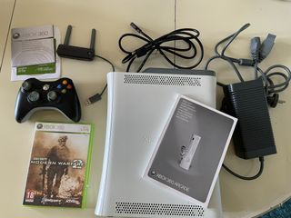 Consola Xbox 360 en color blanco, lista para jugar. Incluye 1 mando (+ otro que le falta la tapa de las pilas), adaptador para Wi-Fi, cable HDMI, manuales de usuario, y los siguientes juegos: - Call of Duty: Modern Warfare 2. - Castle Crashers - Geometry Wars Evolved - Ikaruga - Limbo - Minecraft - Outland - Power Up Forever - Rez HD - Space Invaders Extreme - The Misadventures of Winterbottom (Todos los juegos están guardados en el disco duro de la consola - el único juego físico es el Call of Duty)