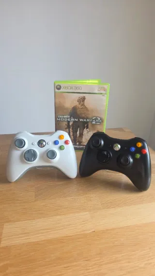 Se venden dos mandos de Xbox 360, uno blanco y otro negro, junto con el videojuego Call of Duty: Modern Warfare 2. Ambos mandos tienen las tapas de los joysticks nuevos a estrenar. - Mando blanco inalámbrico. - Mando negro inalámbrico. - Videojuego Call of Duty: Modern Warfare 2.