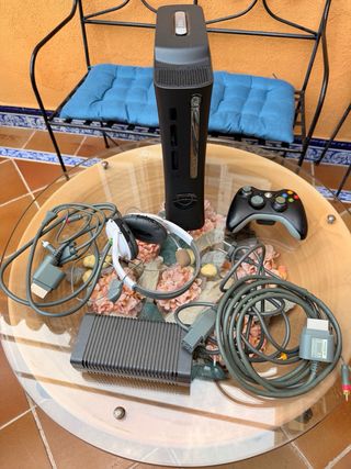 Lote de consolas y accesorios para Xbox. - Consola Xbox 360. - Mando blanco con teclado. Funciona perfecto - Mando dorado con tapa de pilas (no sincroniza) - Mando transparente. Se conecta por cable y no tengo cable - Mando negro. Sin tapa de pilas y no sincroniza - 2 Micrófonos - Juegos (Halo3 y GTA episodes from liberty city) Xbox (error luz verde luz roja) 2 mando que funcionan perfectos 3 juegos (pro4, motogp3 y dead or alive xtreme beach volleyball)