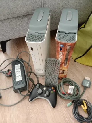 Consola Xbox 360 con accesorios. - Incluye mando. - Incluye fuente de alimentación. - Incluye cables de conexión. -la primera blanca no funciona bien .el CD hay veces sales y hay veces le cuesta la otra no ha sido probada .