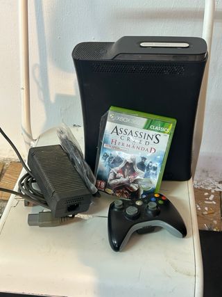 Consola Xbox 360 en color negro, lista para jugar. Incluye el videojuego Assassin's Creed: Hermandad y un mando. - Consola Xbox 360. - Videojuego Assassin's Creed: Hermandad. - Mando de control. - Adaptador de corriente. Al abrir y al cerrar cuesta