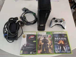 Consola Xbox 360 en color negro, lista para jugar. Incluye los siguientes juegos: - Forza Motorsport 3 - Gears of War 3 - Mass Effect - Mando inalámbrico plateado - Fuente de alimentación - Cable de video