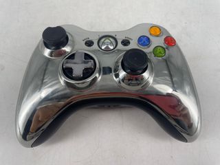 Mando de Xbox 360 con un acabado cromado plateado brillante. FUNCIONA - Diseño moderno y llamativo. - Botones de acción y joysticks negros.