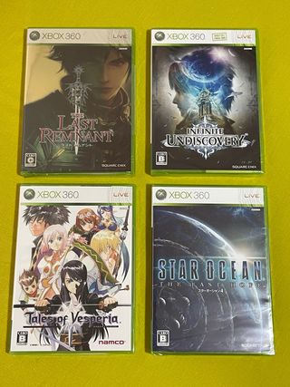 Conjunto de cuatro videojuegos para Xbox 360. Cada uno está precintado con precinto oficial. Región JAP Japan. - The Last Remnant - Infinite Undiscovery - Tales of Vesperia - Star Ocean: The Last Hope Entrega en mano en Mataró o envíos