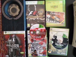 Consola Xbox 360 en color blanco, incluye dos mandos y varios videojuegos. - Consola Xbox 360. - Mando blanco inalámbrico - Mando negro. - Adaptador de corriente - Videojuegos originales como fórmula 1, Nedd For Speed, Call of Duty, Assassin's Creed, etc.