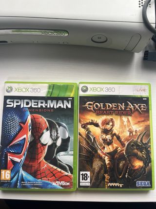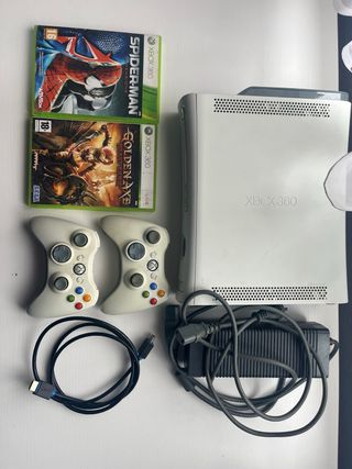 Contiene lo siguiente: - Dos mandos inalámbricos (algo desgastados por el uso, su funcionamiento no se ha podido comprobar ya que no encuentro sus baterías, por lo que sería necesario su compra). - Spider-Man Shattered Dimensions. - Golden Axe Beast Rider. - Fuente de energía. - Cable HDI casi sin usar. - Xbox 360 blanca (se nota su uso y el paso del tiempo, hay algunas cosas que fallan: el disquete al que le cuesta abrirse; la ranura de los USB aunque no afecta en su funcionamiento; y una rotura en la consola que tampoco afecta a su funcionamiento).