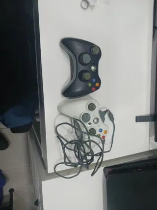 Dos mandos para consola Xbox 360, uno en color negro y otro en blanco, junto con un cargador USB. - Mando negro. - Mando blanco. - Cable cargador USB.