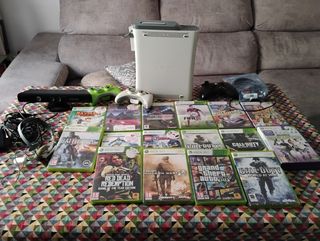 Lote de consola Xbox 360 en color blanco, junto con 21 videojuegos para PC. Precio no negociable - Consola Xbox 360. - Dos mandos para Xbox 360. - Juegos de PC: - RUNAWAY - EL CO ROM DE LOS JUEGOS 2005 - Warhammer 40,000: Dawn of War - Dark Crusade - COMPANY HEROES 2 - EARTH 3D - CASTLE STRIKE - DATA BECKER - DEADLY TYZEN - INFOGRAMES - GAME BROTHERS IN ARMS PACK - THE SETTLERS: EL LINAJE DE LOS REYES - WARCRAFT III - AGE OF MYTHOLOGY - HEAVY GEAR II - XPLOSIV - DYNASTY WARRIORS 6 - STARCRAFT - Playstation 2 Pro Evolution Soccer 3 - Cables de conexión.