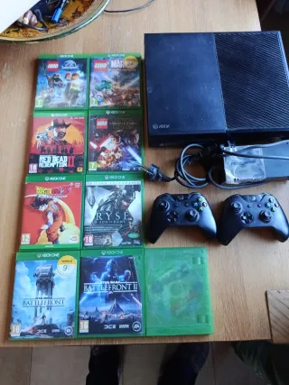 Consola Xbox One en color negro, incluye Kinect y dos mandos. La consola esta rayada en la parte arriba por el uso a lo largo del tiempo y tiene una marca. Pero esta en perfectas condiciones. La vendo porque ya no la uso. - Juegos incluidos: - Call of Duty Black Ops III - GTA 5 (sin caja) - Gears of War - The Crew - Battlefield 1 - FIFA 16 - Call of Duty Ghosts - Dying Light - Titanfall - Forza - Need for Speed - Battlefield 4 - Far Cry 5 - Battlefront Incluye la caja, 2 mandos, todos los cables y accesorios, kinect y los juegos. #xbox #xboxone #consola #playstation4 #playstation5 #videojuego