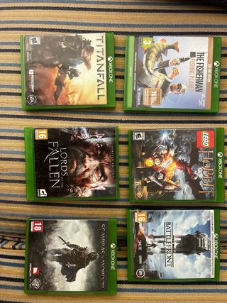 Lote de seis videojuegos para Xbox One, también disponibles para venta individual. - Titanfall -Lord of the Fallen - Star Wars Battlefront - Sombras de Mordor - The Fisherman - lego Hobbit Cada juego es 20€