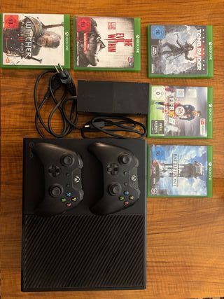 Consola Xbox One en color negro, lista para horas de diversión. Incluye dos mandos inalámbricos y cinco videojuegos. - The Witcher 3: Wild Hunt - The Evil Within - Rise of the Tomb Raider - FIFA 16 - Star Wars Battlefront