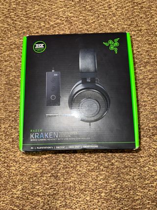 Auriculares gaming Razer Kraken Tournament Edition con controlador de audio USB. - Diseño ergonómico. - Compatibles con PC, PlayStation 4, Switch, Xbox One y smartphones. - Incluye controlador de audio USB. Se han usado de forma continua, pero están bien cuidados. Utilizados tanto casualmente como en competitivo de juegos FPS, Combate, Deportes, etc. El cable cuenta con un medidor del volumen y silenciador para el micrófono. Se han usado tanto en PC como en PS4 y PS5, y no ha habido ningún problema. El precio es negociable