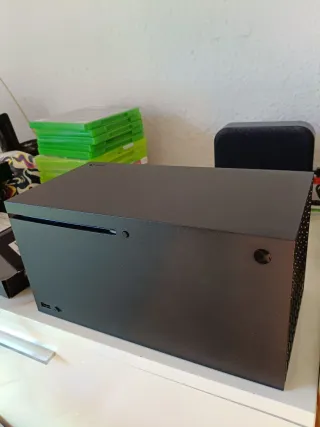 Consola Xbox Series X en color negro con detalles en verde. - Capacidad de 1 TB SSD. - Soporta 4K y 120 FPS. La compré hace una semana, y no tuve en cuenta de tener una TV que mueva los 120Hz para disfrutar los juegos de series X, por ejemplo el Red Dead II de Xbox ONE X lo mueve de maravilla en mi TV, pero los de Xbox series x que funcionan a 120Hz y he probado no los puedo disfrutar en mi TV actual. Ese es el motivo de su venta, la consola está impoluta y con garantía de Microsoft hasta septiembre. Incluyo el mando de la imagen, sus cables originales y la caja. Se puede venir a ver y probar sin compromiso. Saludos!