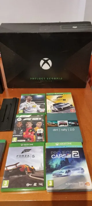 Consola Xbox One X Edición Project Scorpio con disco duro de 1TB. - Incluye mando original. - Incluye base vertical. - Incluye cargador de mando. - Incluye varios juegos: Forza Motorsport 7 ultimate Forzá motor 5 Dirt rally 2.0 Assetto corsa prestigio edition F1 2023 Fifa 18 Project cars 1 limted edition Project cars 2 limitada edition Project cars 3 - Incluye cables de conexión.