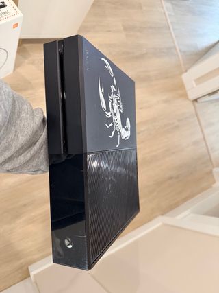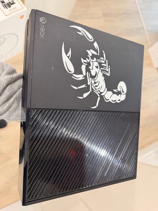 Consola Xbox One en color negro con un diseño personalizado de escorpión en la parte superior. La parte frontal presenta una rejilla de ventilación con un acabado brillante. - Diseño de escorpión blanco. - Rejilla frontal con líneas diagonales.