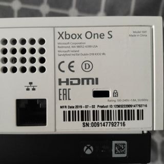 Consola Xbox One S en color blanco. - Modelo 1681. - Fabricada en China. - Fecha de fabricación: 07-02-2019. - ID de producto: 12565222009147792716. - Número de serie: 009147792716. - Voltaje: 100-240V, 1.8A, 50/60Hz.
