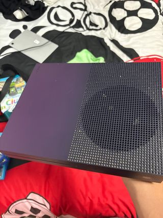 Xbox One S de color morado. Presenta algunas marcas de uso visibles en la parte superior. - Incluye una consola Xbox One S. - Perfecta para jugar tus videojuegos favoritos.