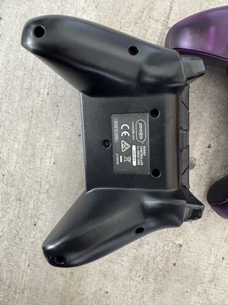 Se venden dos mandos para Xbox de la marca PDP. Uno es negro con camuflaje y el otro es morado translúcido. - Mando negro con diseño de camuflaje. - Mando morado translúcido. Al negro le cuesta presionar la A