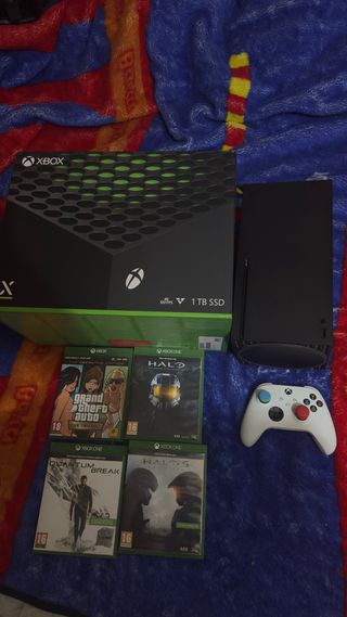 Consola Xbox Series X en color negro, con 1 TB de SSD. Incluye los siguientes juegos: - Grand Theft Auto V: The Trilogy – The Definitive Edition - Halo: The Master Chief Collection - Quantum Break - Halo 5: Guardians - Halo Infinite