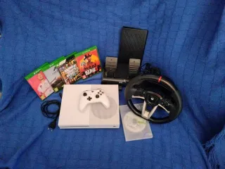 NO NEGOCIABLE, NO ENVIO POR WALLAPOP, NO VENDO SUELTO, NO CAMBIO Pack completo de consola Xbox One S con 1TB de almacenamiento, perfecto para horas de entretenimiento. - Consola Xbox One S blanca. - Mando inalámbrico blanco. - Volante de conducción con pedales. - Juego: Red Dead Redemption 2. - Juego: Grand Theft Auto V. - Juego: Forza Horizon 3. - Juego: FIFA 21. - Juego: WRC 5.