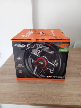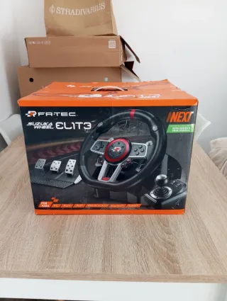 Volante de conducción FR-TEC ELIT3 con pedales y palanca de marchas. - Compatible con PC, PS5, PS4, PS3, Xbox Series X/S y Switch. - Diseño deportivo con detalles en rojo y negro. - Incluye volante, pedales y palanca de cambios.