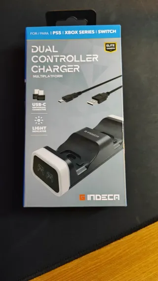 Cargador dual para mandos de consolas. - Compatible con PS5, Xbox Series y Nintendo Switch. - Conexión USB-C universal. - Indicador de carga LED. Nuevo, a estrenar. Caja precintada y sin ningún tipo de uso.