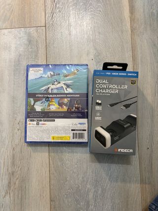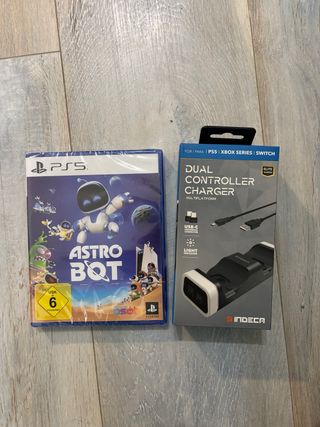 Lote de videojuego Astro Bot para PS5 y cargador universal de mandos. Nuevo precintado - Videojuego Astro Bot para PlayStation 5. - Cargador dual para mandos compatible con PS5, Xbox Series y Switch. - Conexión USB-C universal.